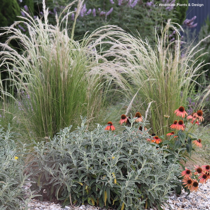 Sporobolus airoides is native to western North America, Central Mexico and parts of Canada. It is able to grow in desert regions and in soils with high salt content. Prefers a well drained sunny spot. Perfect in gravel gardens or gardens of a re-wilding nature. The foliage ranges in colour from silvery-green in Summer to golden with orange hues in Autumn. Summer flowering is a cloudy haze of pink seed heads which rise on tall upright stems above the foliage. 80-100cm high x 60cm wide.