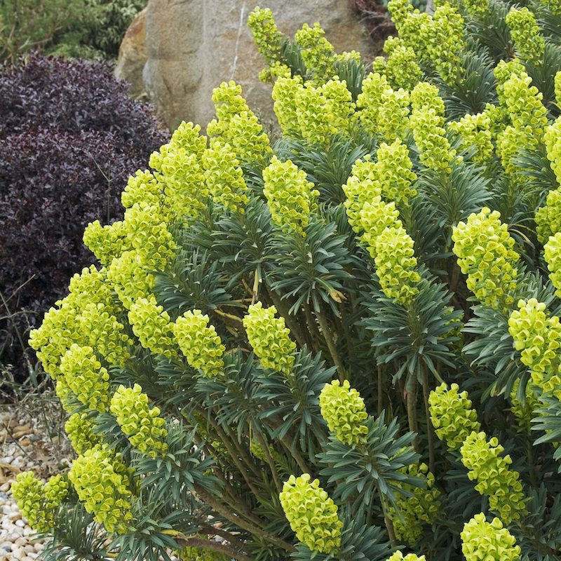 A highly rewarding Euphorbia that performs at its height in late Winter and Spring. It's narrow blue green leaves are topped with chartreuse coloured bottle brush like flowers. Truly eye catching when in flower. Known for its 'no fuss' qualities Euphorbia wulfenii thrives in well drained soils in full sun. Humidity and poor drainage are its downfall. Typically grows 1m x 1m. As with all Euphorbia, the sap is poisonous so wear gloves and glasses when dealing with it. Vermin, pest and disease resistant.