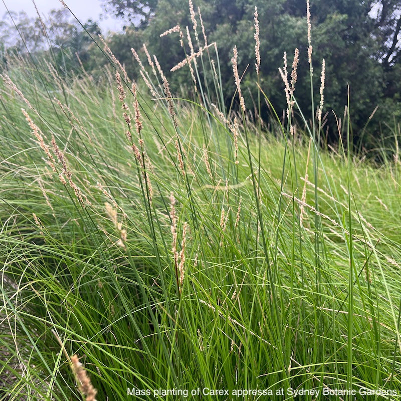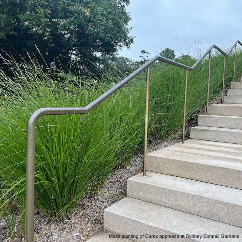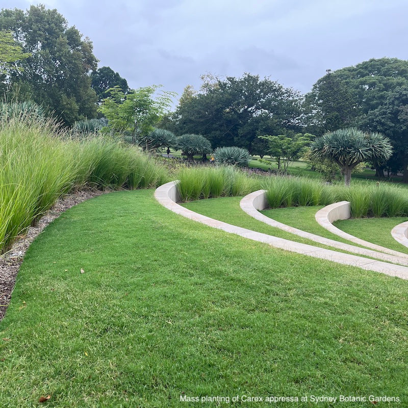 Carex appressa impressed us with a mass planting at the botanic gardens in Sydney (see photos). It is a handsome native grass-like sedge which enjoys areas of poor drainage. In contrast Carex appressa will also grow well in drier zones. Lime green to mid green foliage, grows to a height and width of 80cm. Frost tolerant and drought tolerant once established.