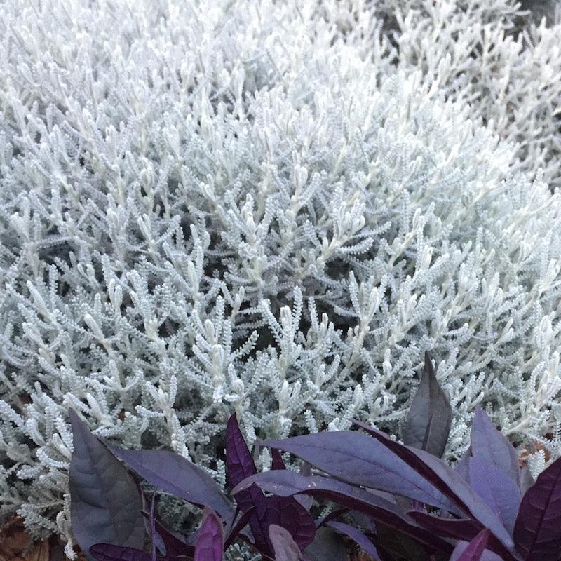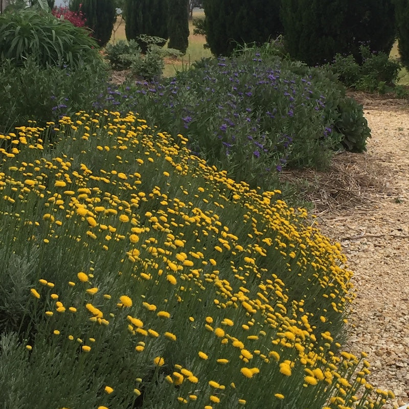 An evergreen low spreading shrub featuring silver grey tiny leaves which form a small compact mound approximately 30cm high. Dainty, yellow button-like flowers are produced above the foliage in Summer. Enjoys full sun and dry conditions. Frost and drought hardy. This sub-shrub lends itself very well to pruning into tight silver spheres.